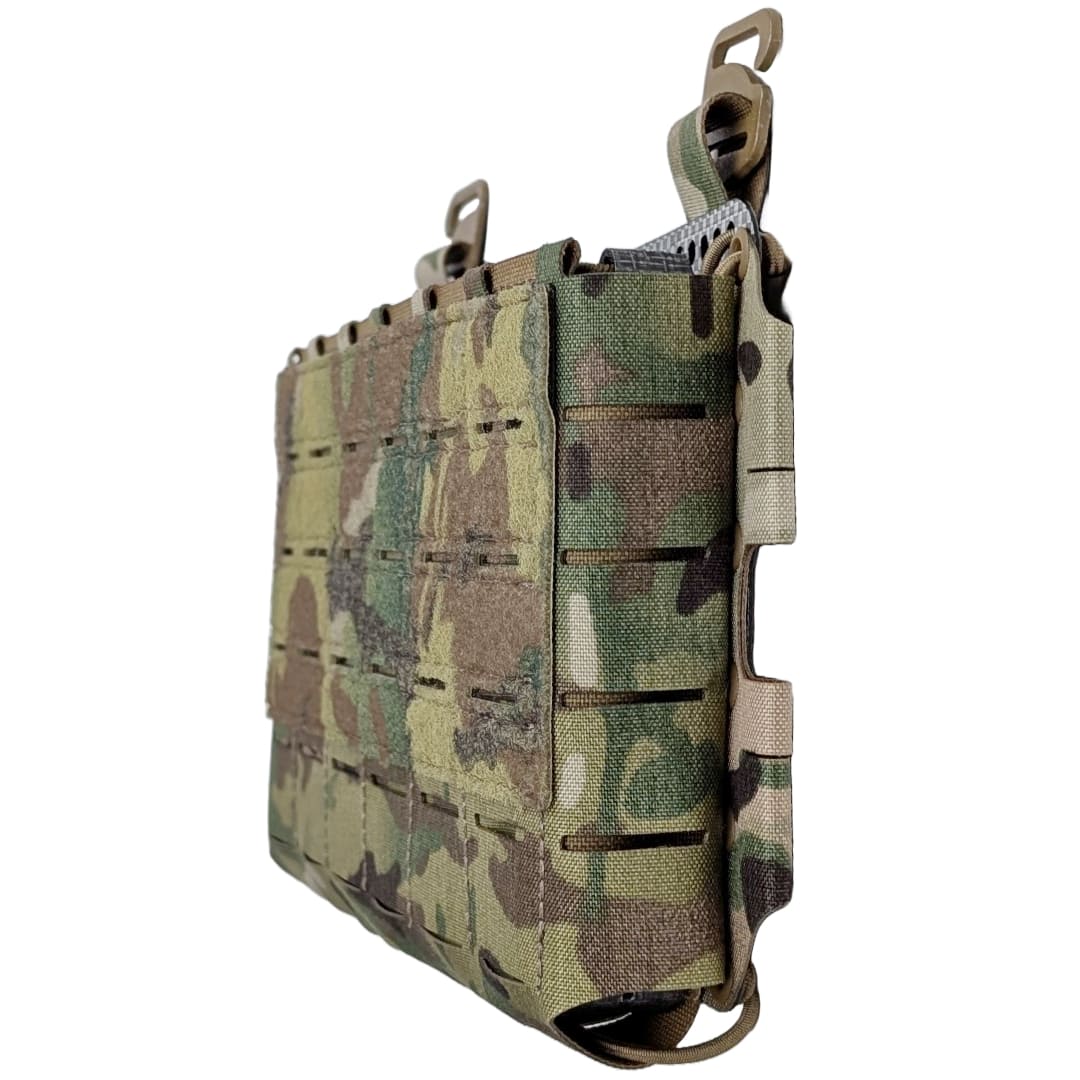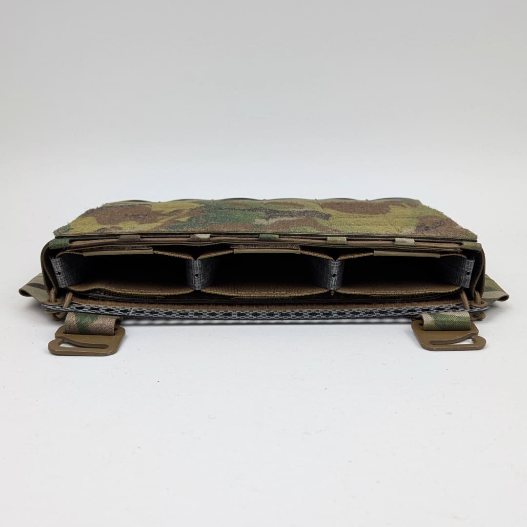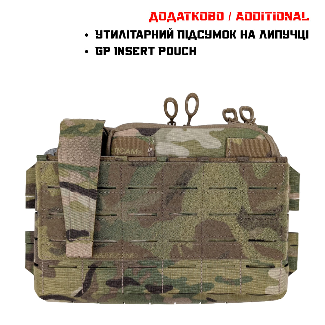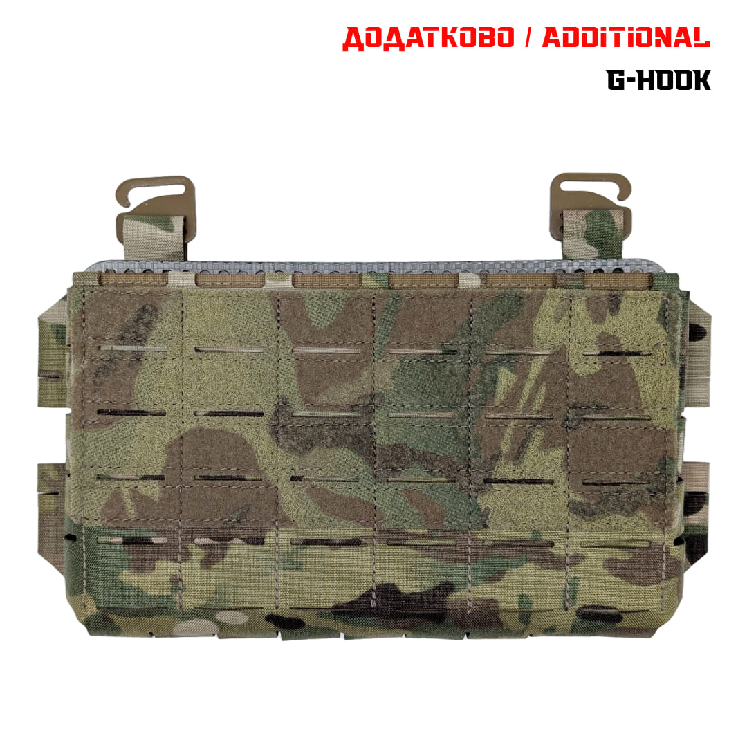Pangolin Placard is a front panel pocket that is designed to be used on a tile plate carrier, or can be assembled into a clean-rig. The pocket is equipped with a Frame Elastic Insert for AK/AR-15 for 3 or 4 mags, or for AR-10 (308) for 3 mags. It can be attached to the MOLLE plate carrier on top of the pouch with Fastex or G-Hook. On the reverse side, it has a Velcro hook for attaching to the plate carrier. On the sides there is a place for attaching ROC/80/BC or Tubes 4" Split Bar. There is also a place on the sides for 4 25mm fasteners. The width of the Placard is adjustable with a round elastic band.